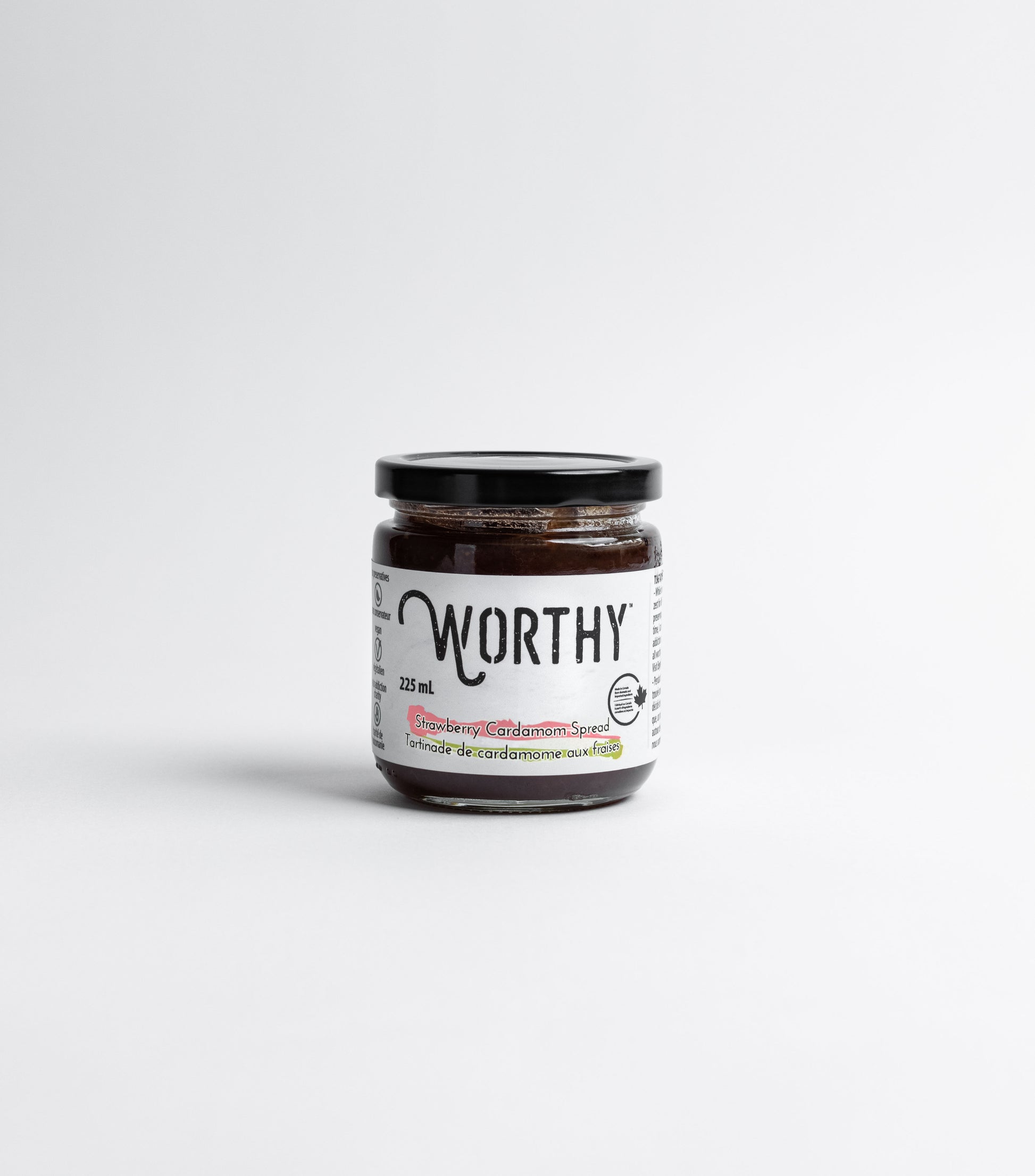 Nestled inside a compostable organic cotton bag is one full-sized (235mL) Worthy Spread. Includes 1 Jar of Strawberry Cardamom Spread, 2 Worthy Recipe Cards, & 1 Worthy Reusable & Compostable Draw-String Bag. Enjoy!